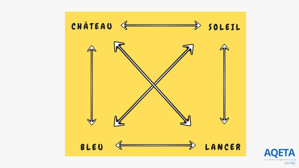 Écrire des phrases avec 4 mots placés aux 4 coins d’un carré. Les inter-changer à souhait!