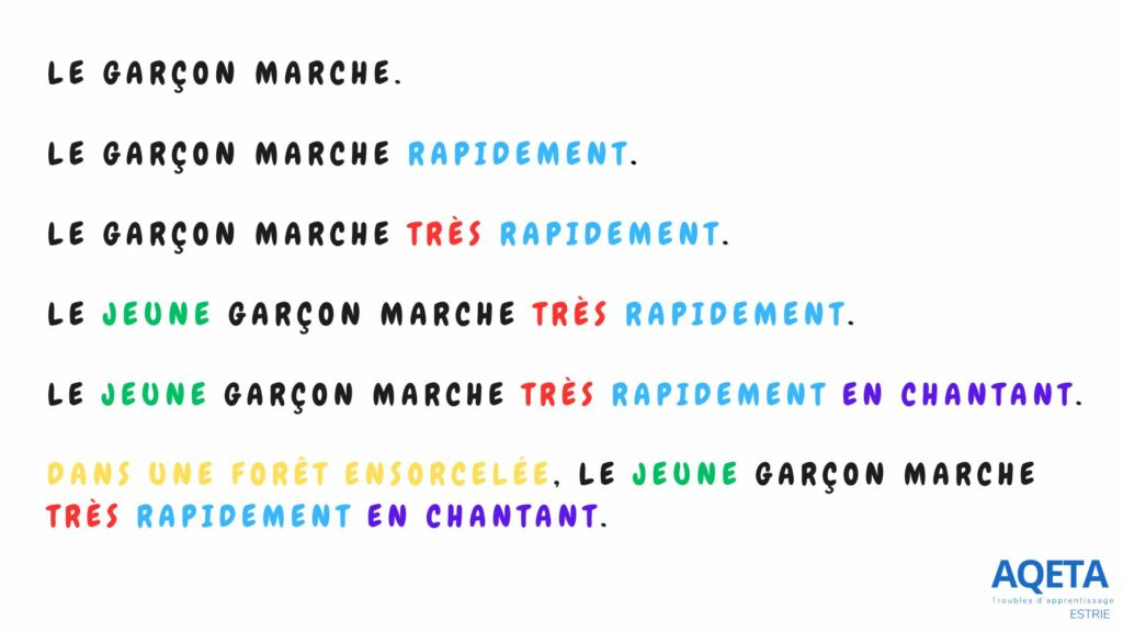 On débute par une phrase simple, puis, chacun son tour, on ajoute un mot n’importe où dans la phrase. La phrase s’étire comme un élastique! À noter que ce jeu se fait bien à l’ordinateur puisque c’est plus facile d’insérer des mots.